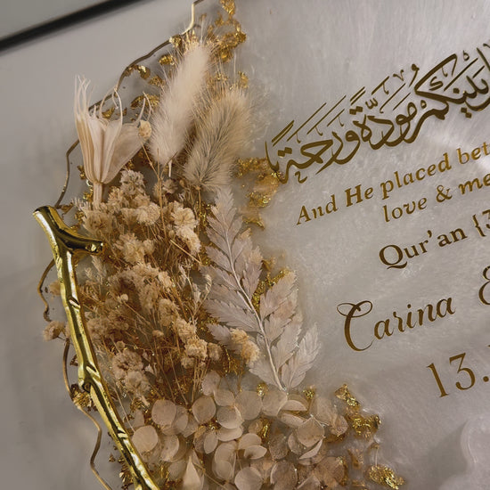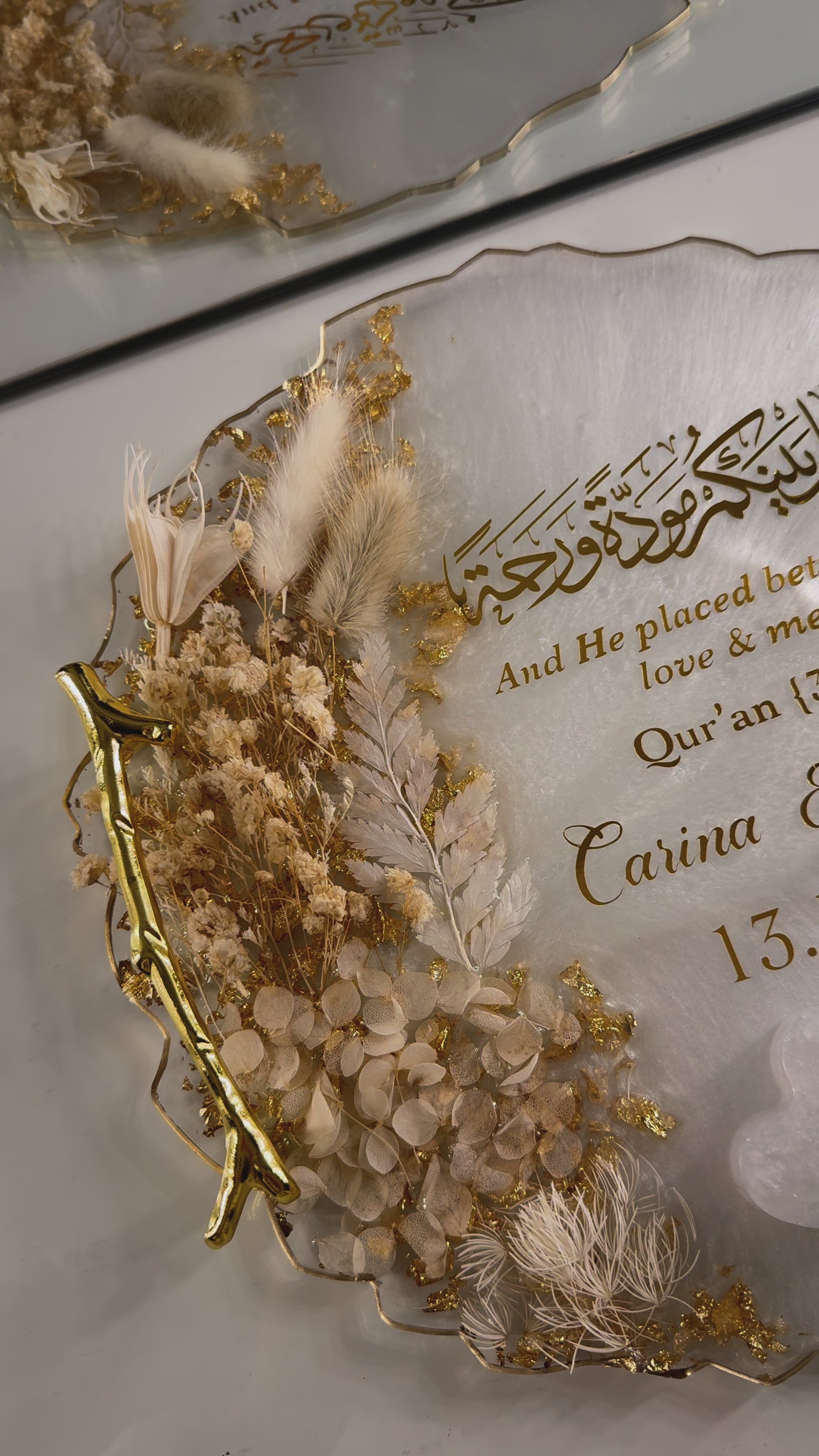 A beautiful and elegant ring tray. Using real white and beige dried flowers, preserved beautifully in resin. Complimented with gold flakes for a vibrant look. Personalised with gold chrome vinyl and gold branch handles.