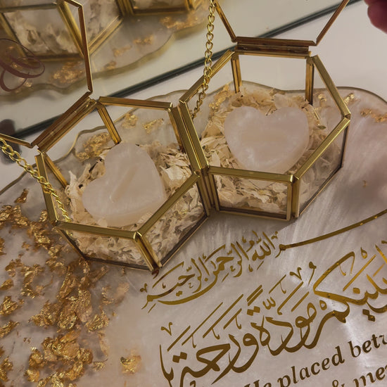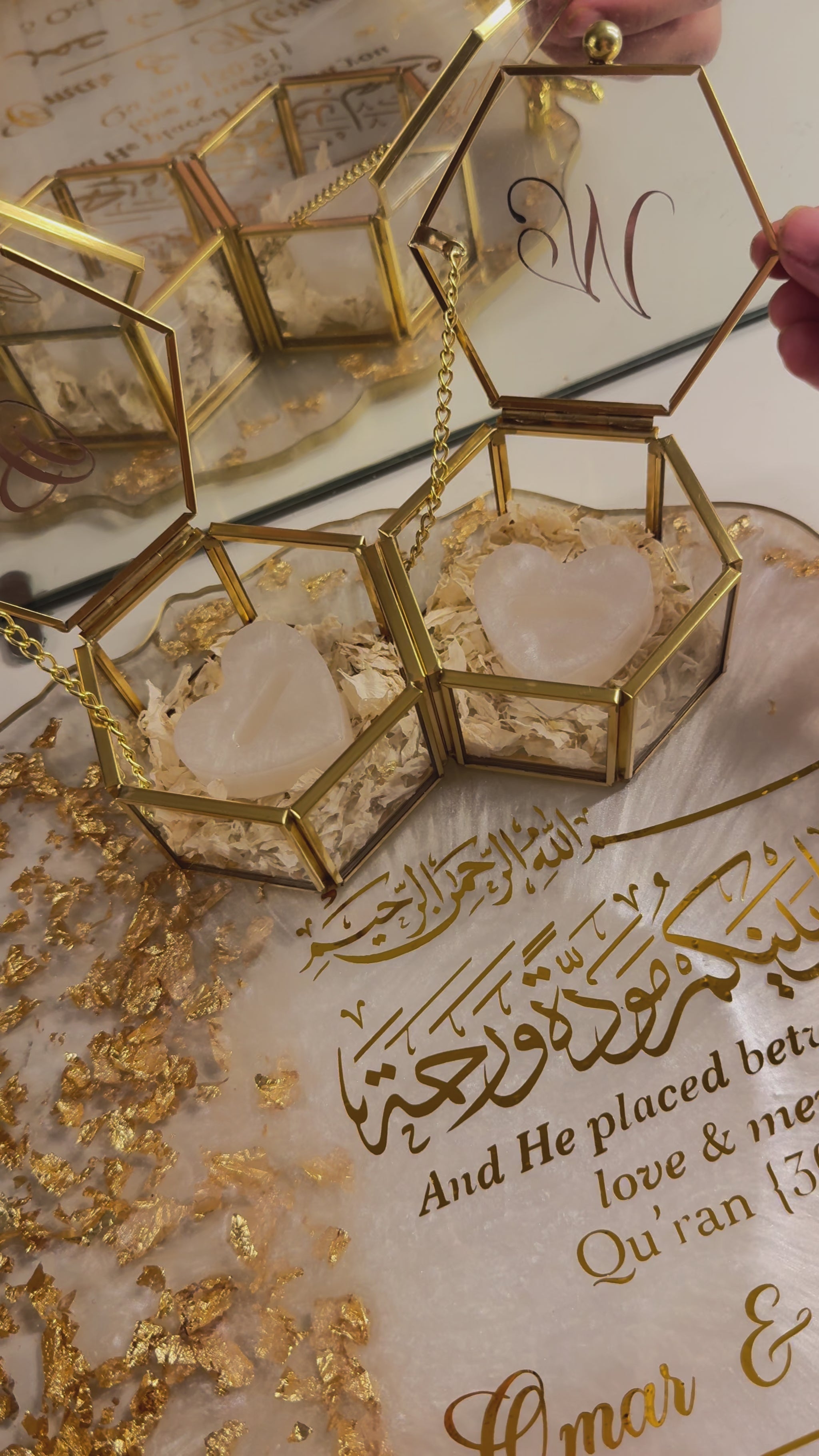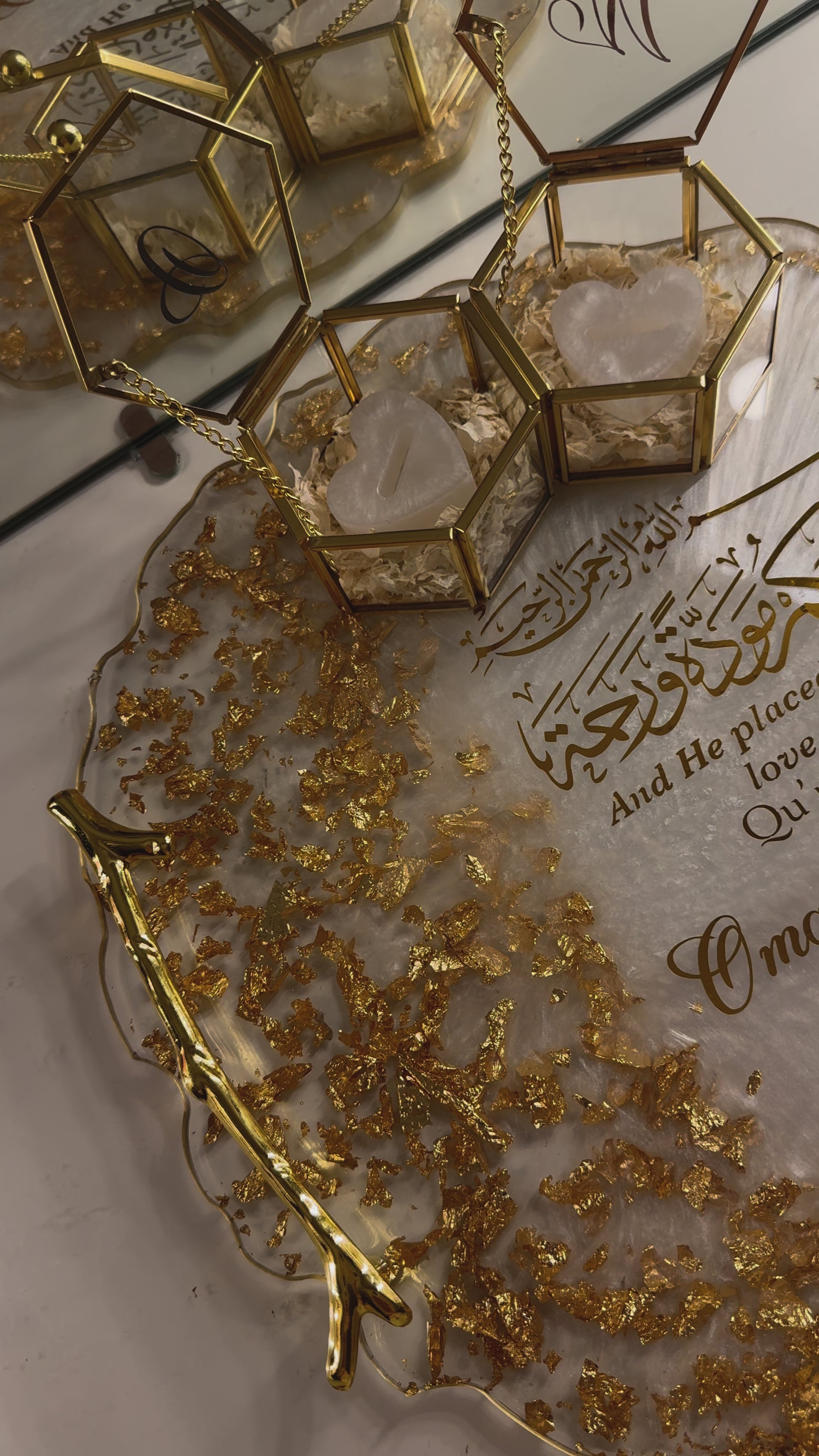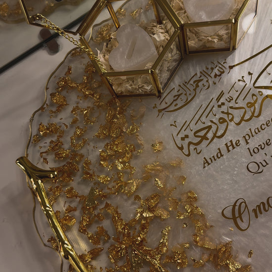 A beautiful and elegant ring tray. Complimented with gold flakes for a vibrant look. Personalised with gold chrome vinyl and gold branch handles.