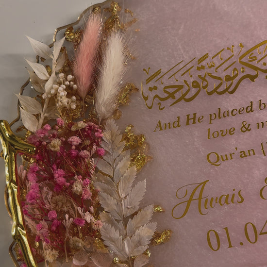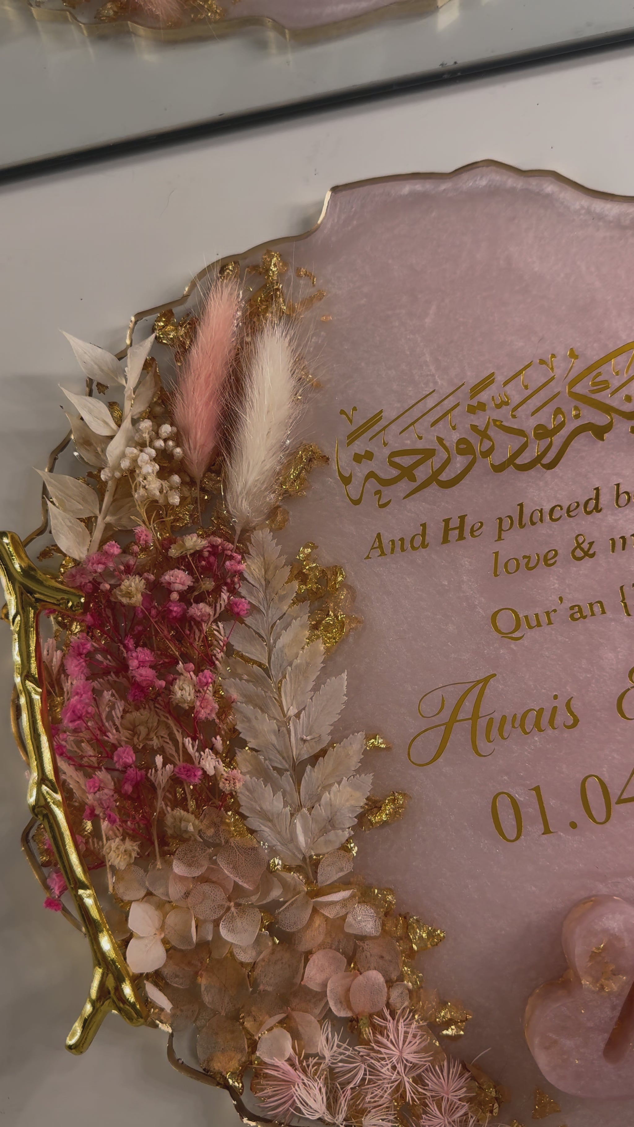 A beautiful and elegant ring tray. Using real white and pastel pink dried flowers, preserved beautifully in resin. Complimented with gold flakes for a vibrant look. Personalised with gold chrome vinyl and gold branch handles.
