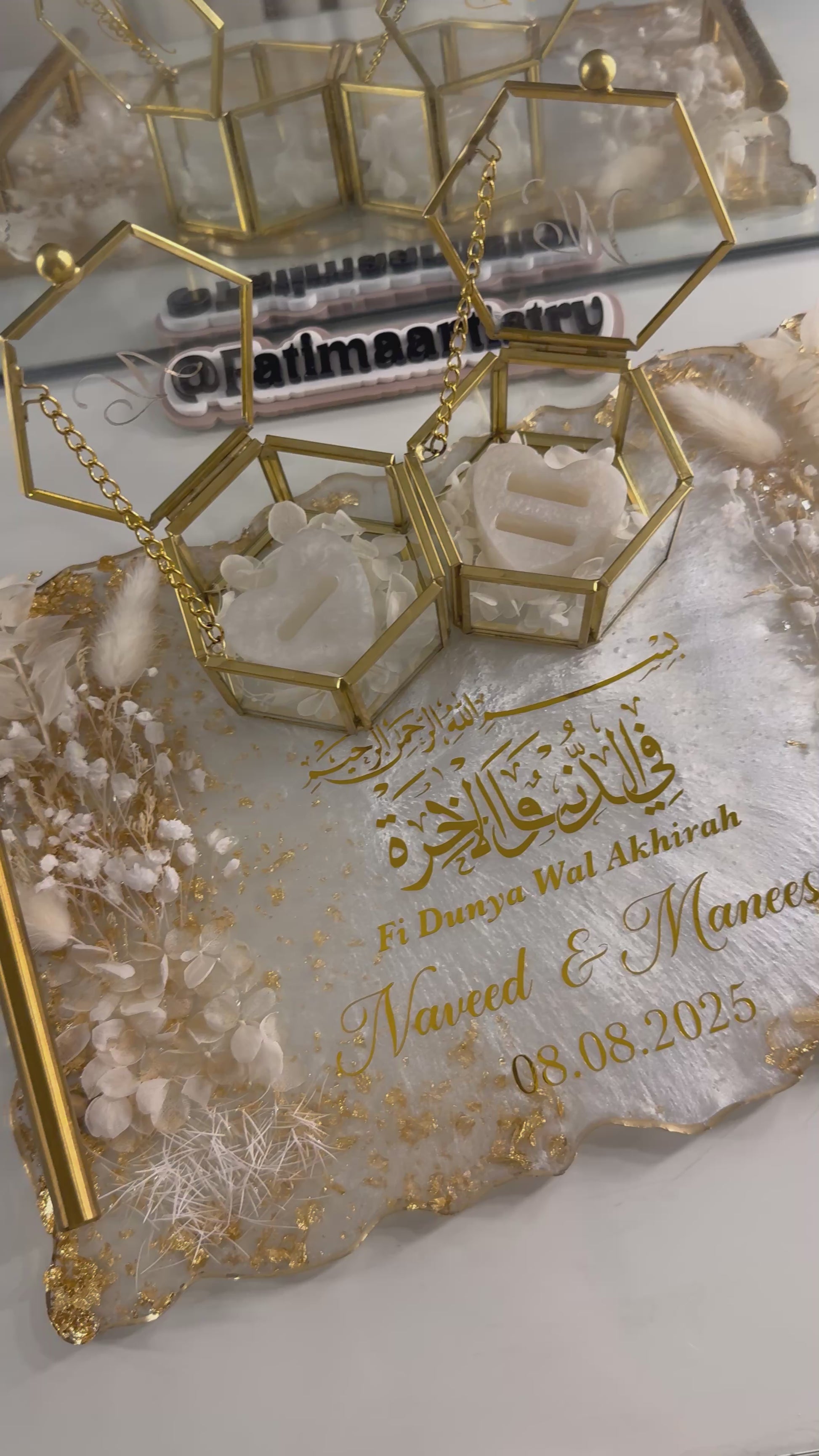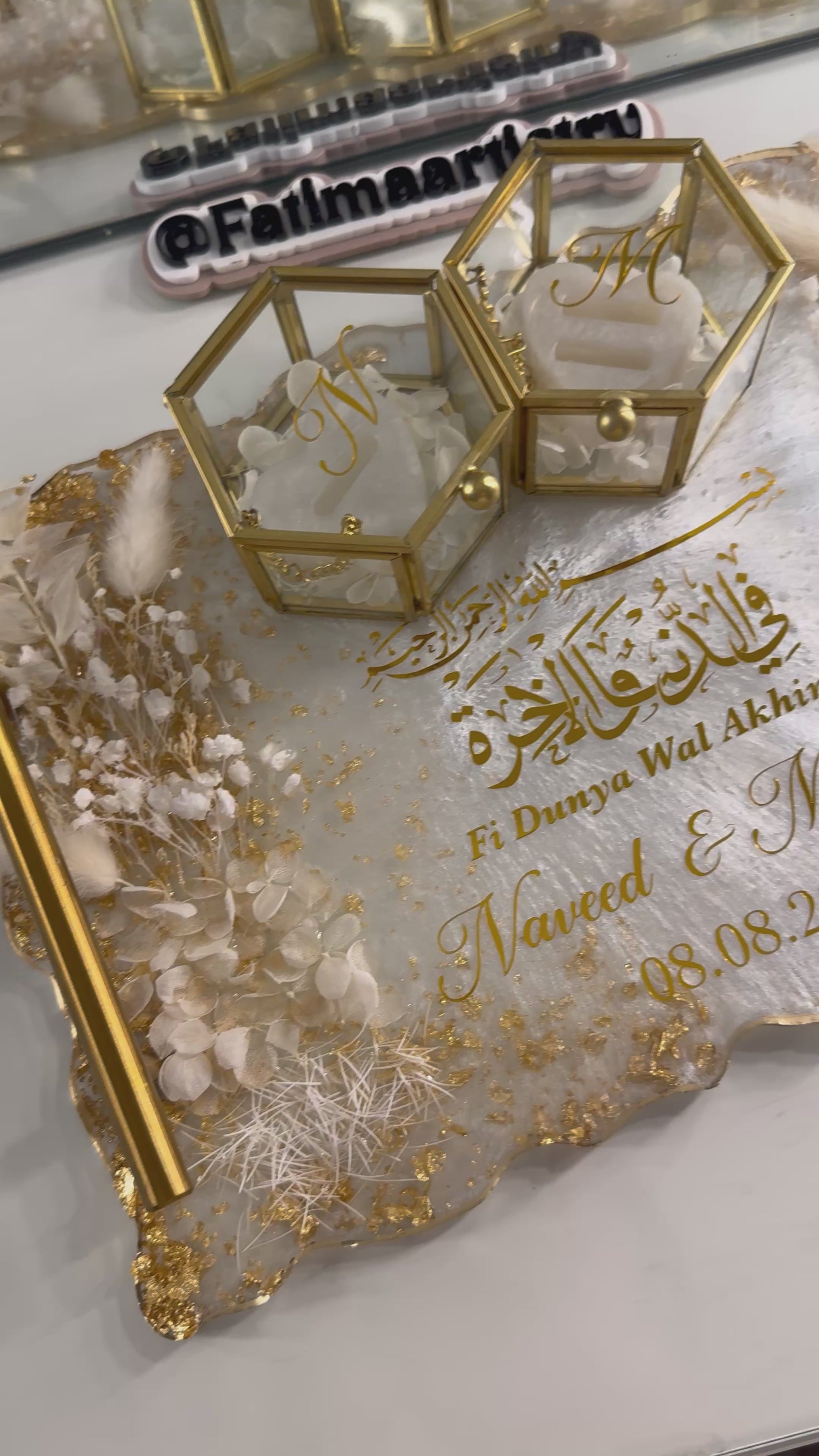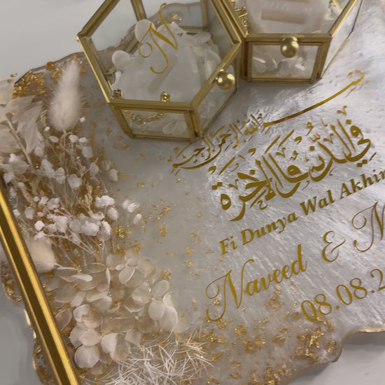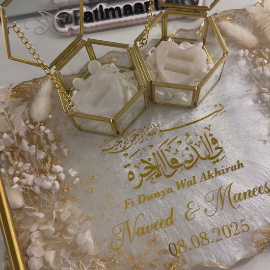 A beautiful and elegant ring tray. Complimented with real dried white flowers and gold flakes for a vibrant look. Personalised with gold chrome vinyl and gold handles