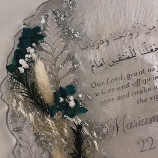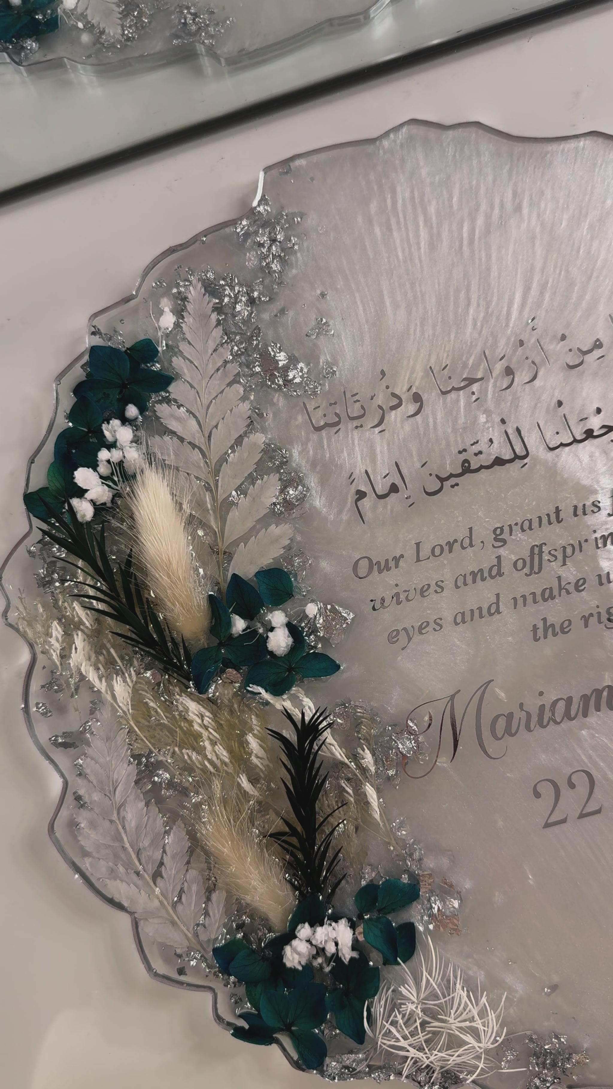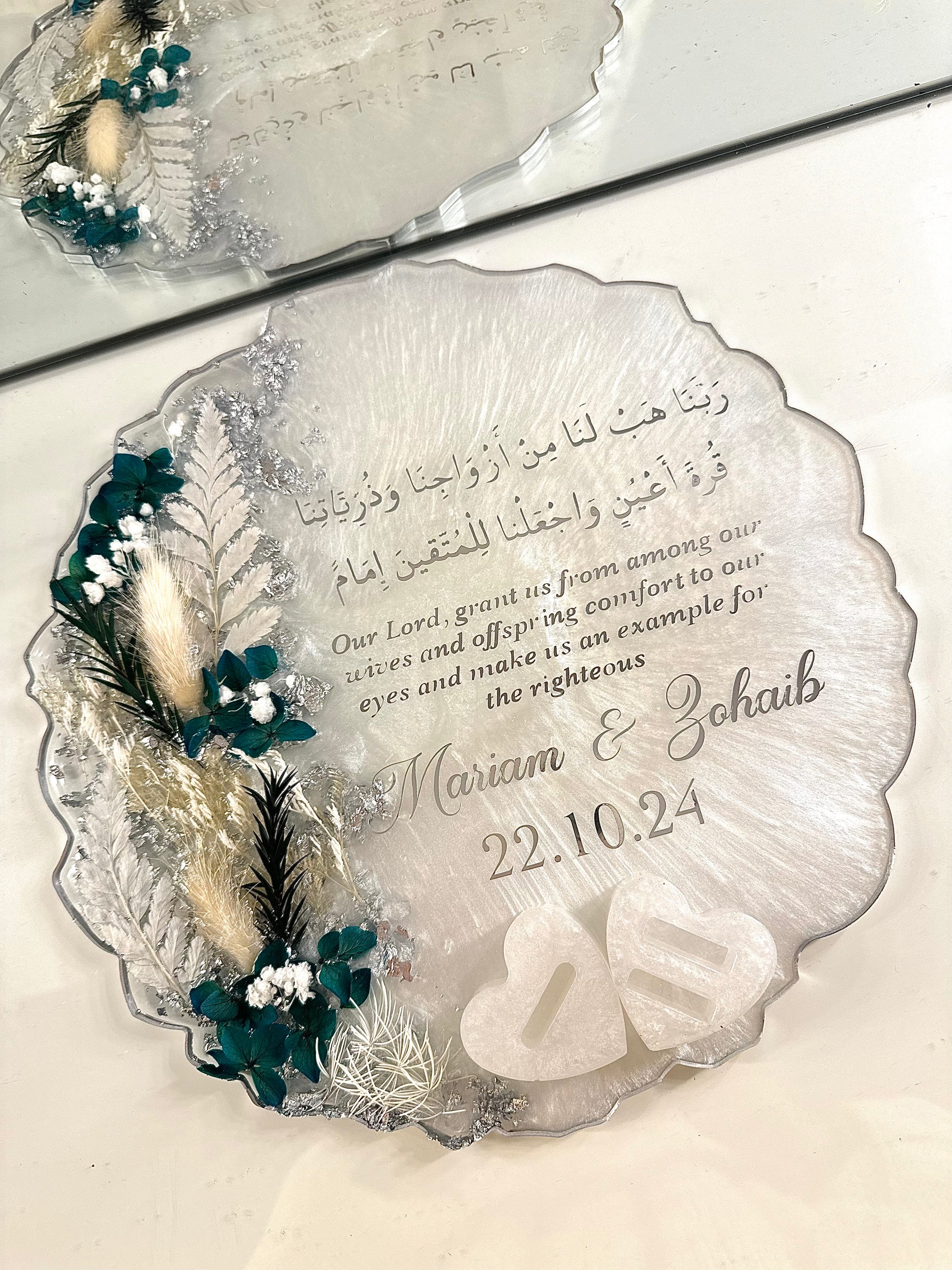 A unique and timeless ring tray. Using real white petals and emerald green dried petals preserved beautifully in resin. Complimented with silver flakes for a vibrant look. Personalised with silver chrome vinyl and silver branch handles.