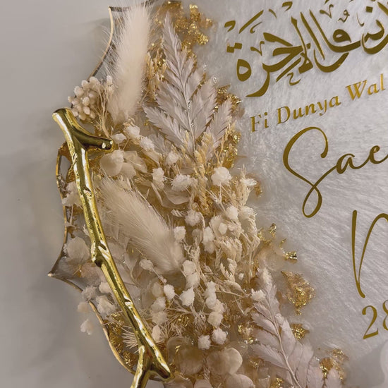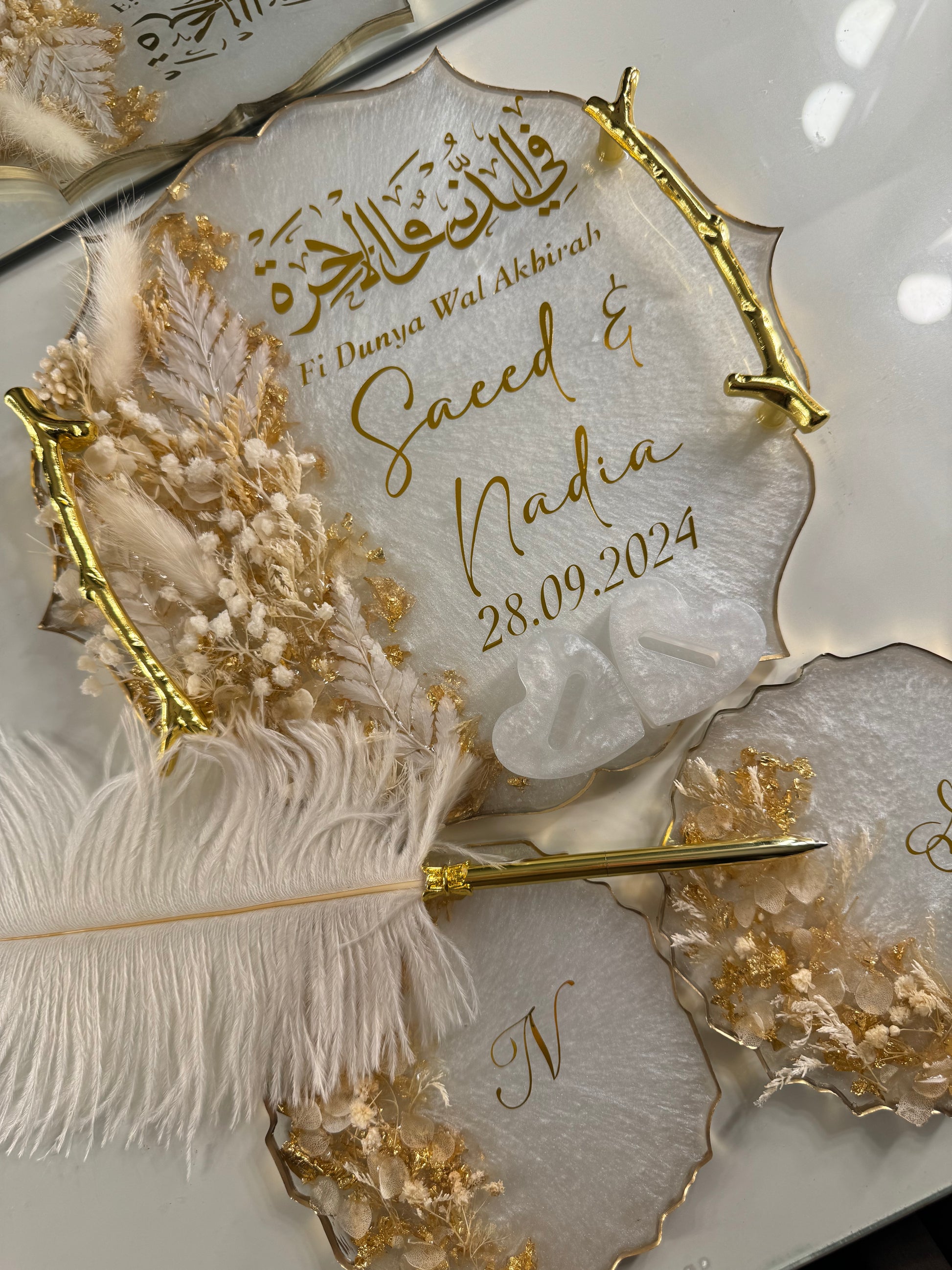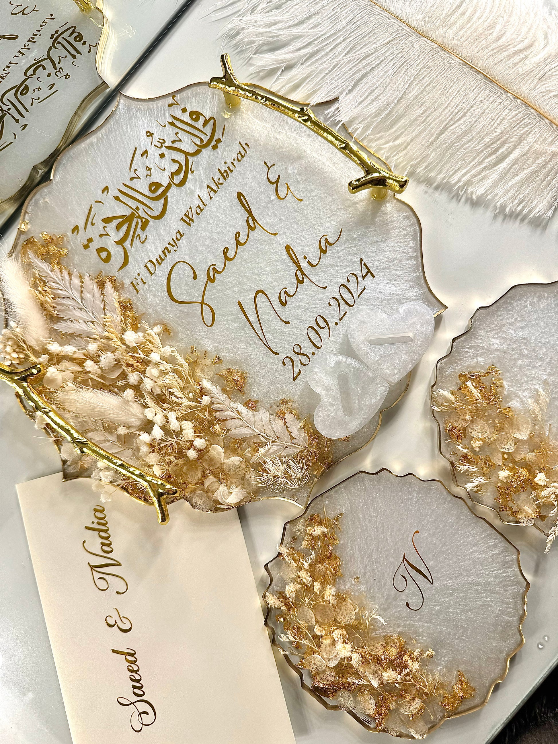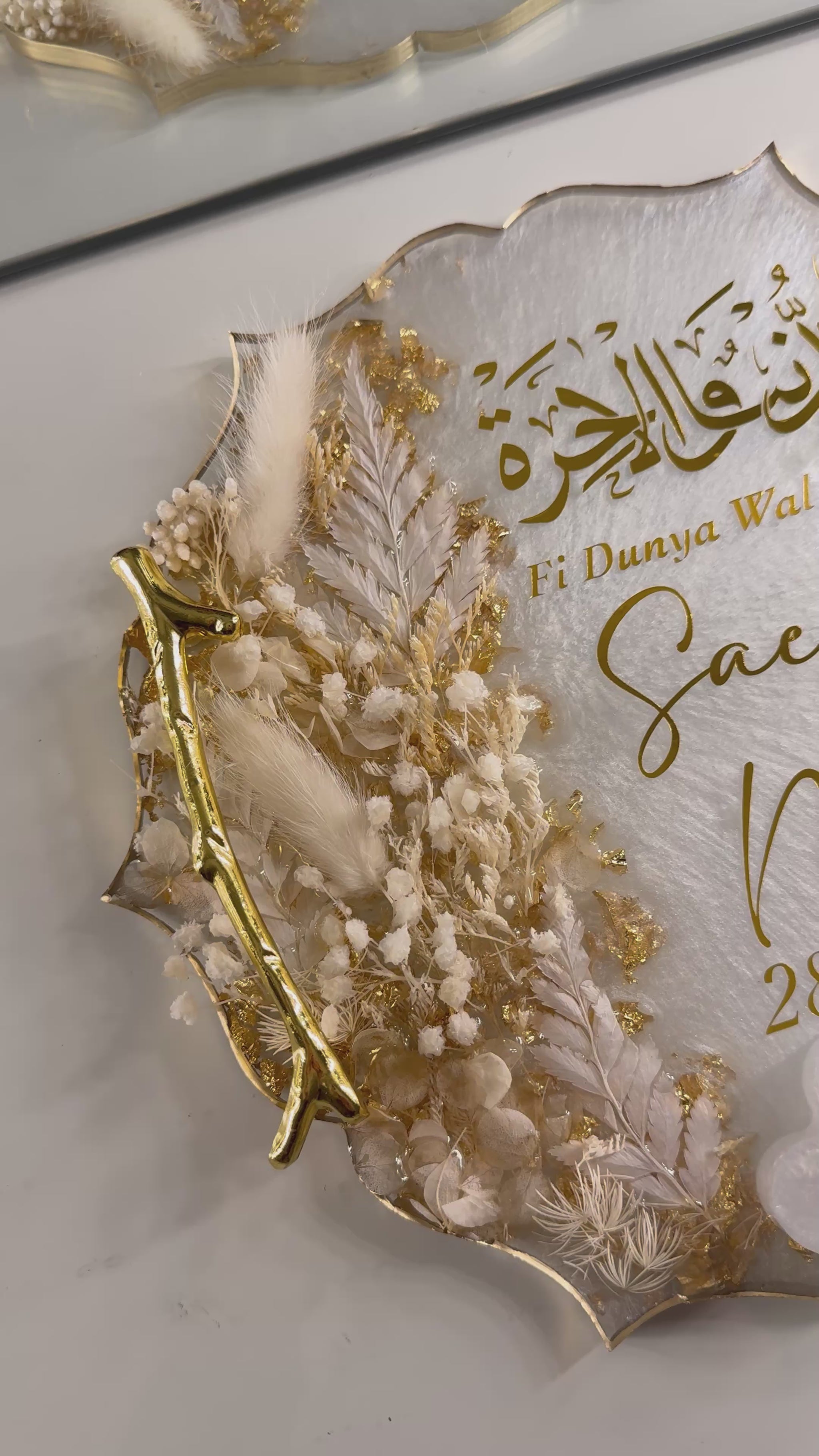 Featuring a NEW trendy ring tray shape - Mandala! How stunning is this piece, complimented with real dried white flowers and gold flakes scattered.