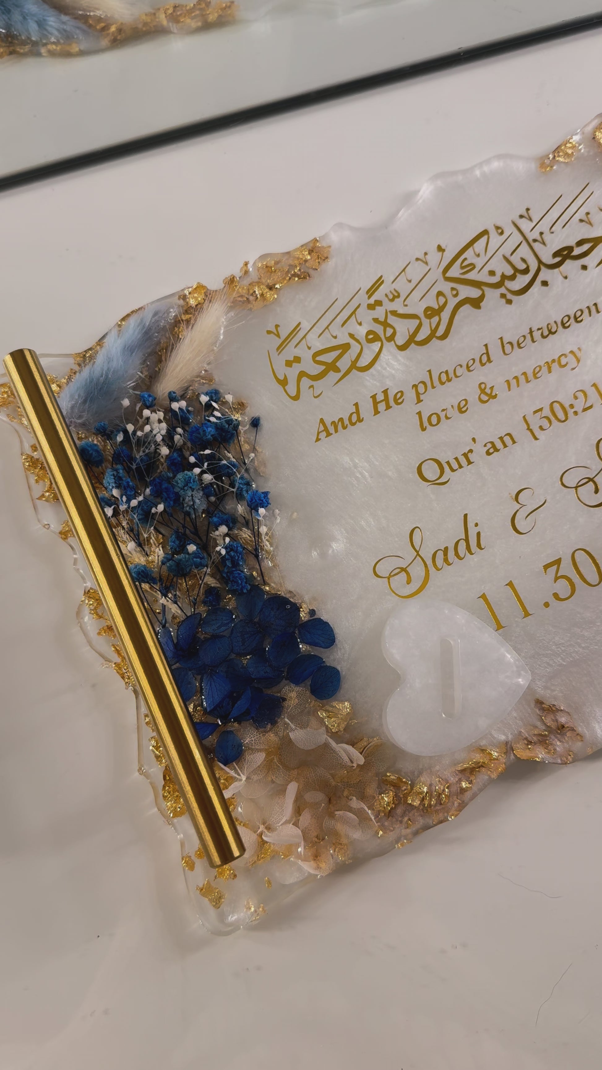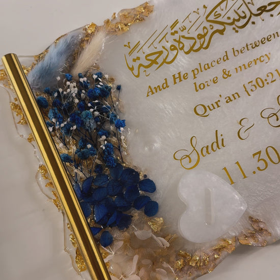 A unique blend of navy/royal blue with gold dried flowers preserved beautifully on top of the resin. Complimented with gold flakes for a vibrant look. Personalised with gold chrome vinyl and gold handles.