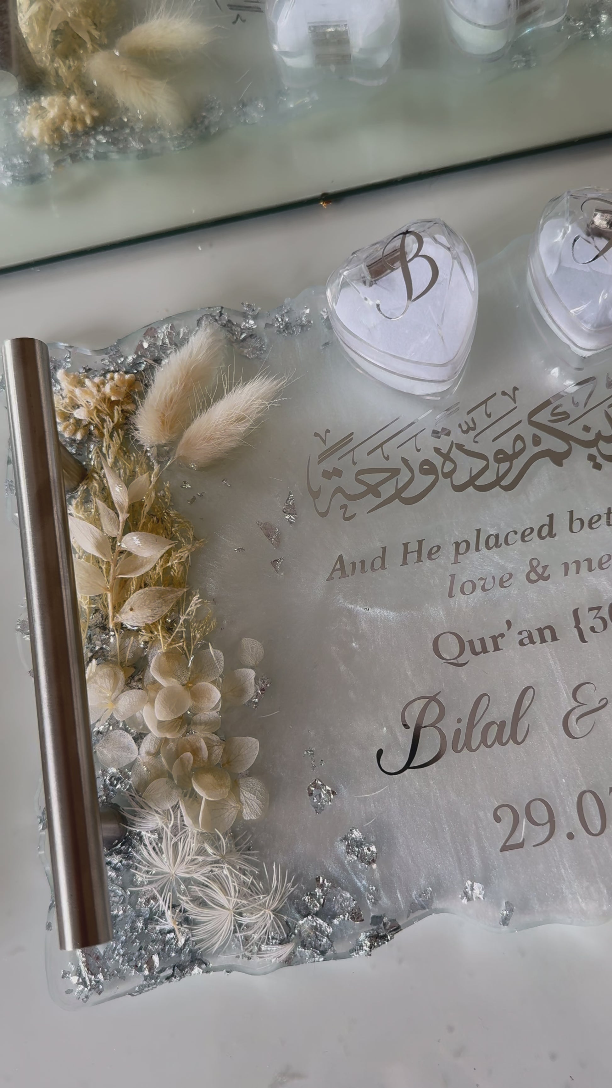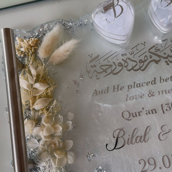 Rectangle silver flaked tray. This tray has white dried flowers and bunny tails preserved beautifully on top of silver flakes. Complimented with silver chrome vinyl and silver handles.