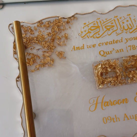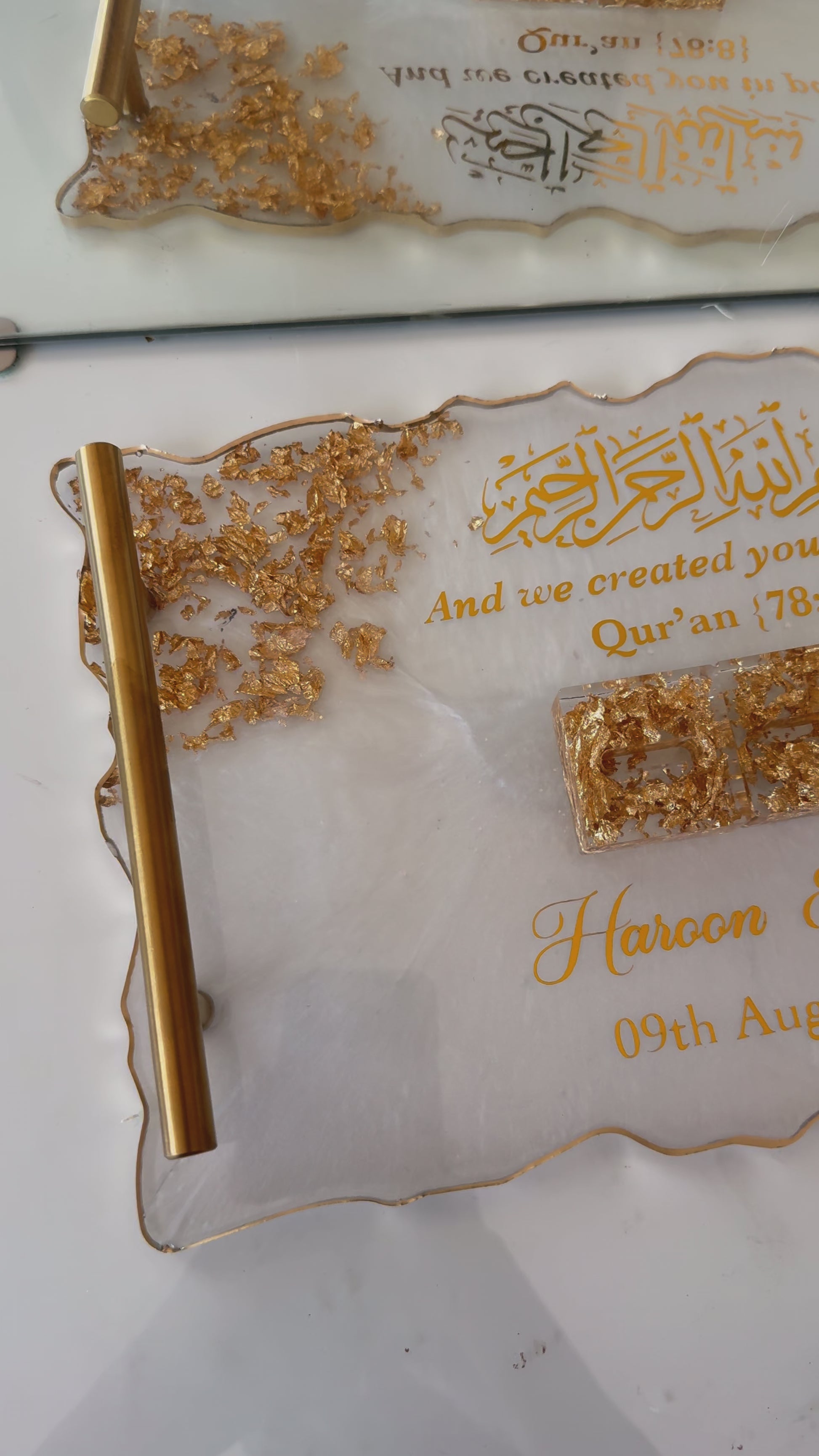 A unique tray with gold flakes preserved beautifully on top of the resin. Complimented with a bold white centre with gold flakes in each corner. Personalised with gold chrome vinyl and gold handles.