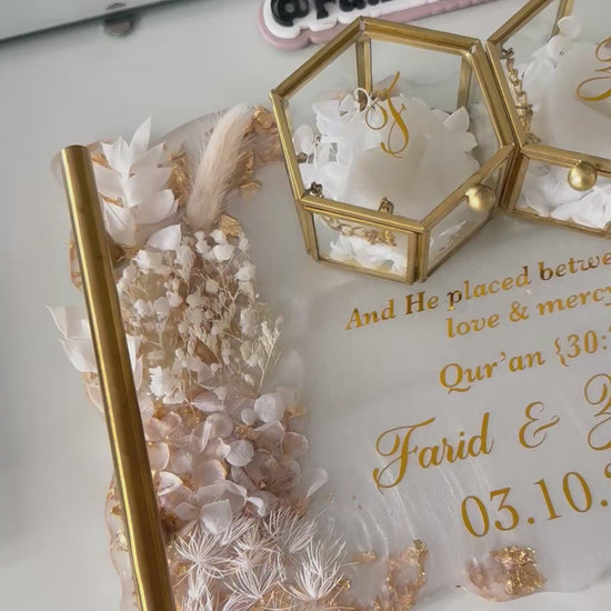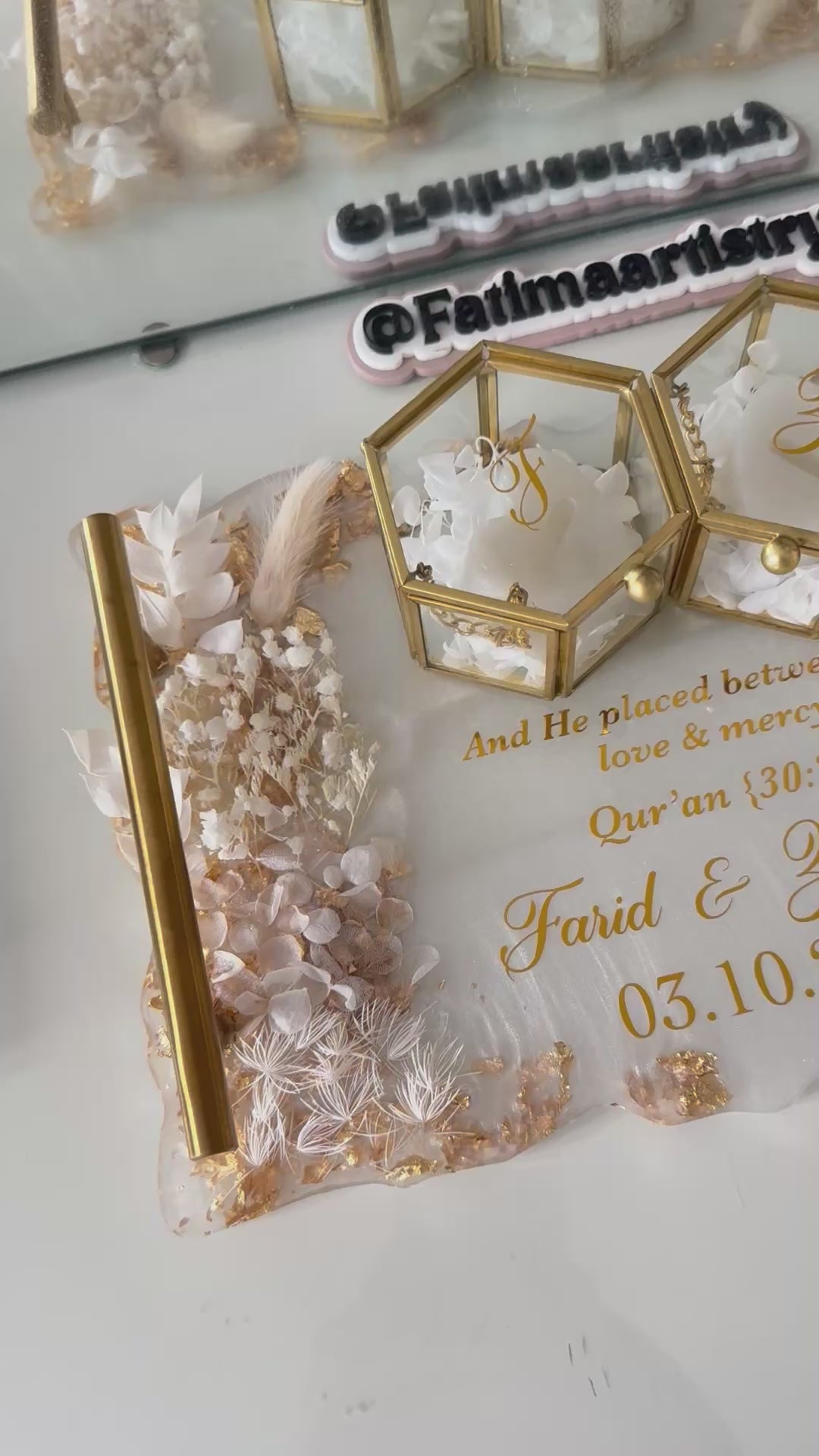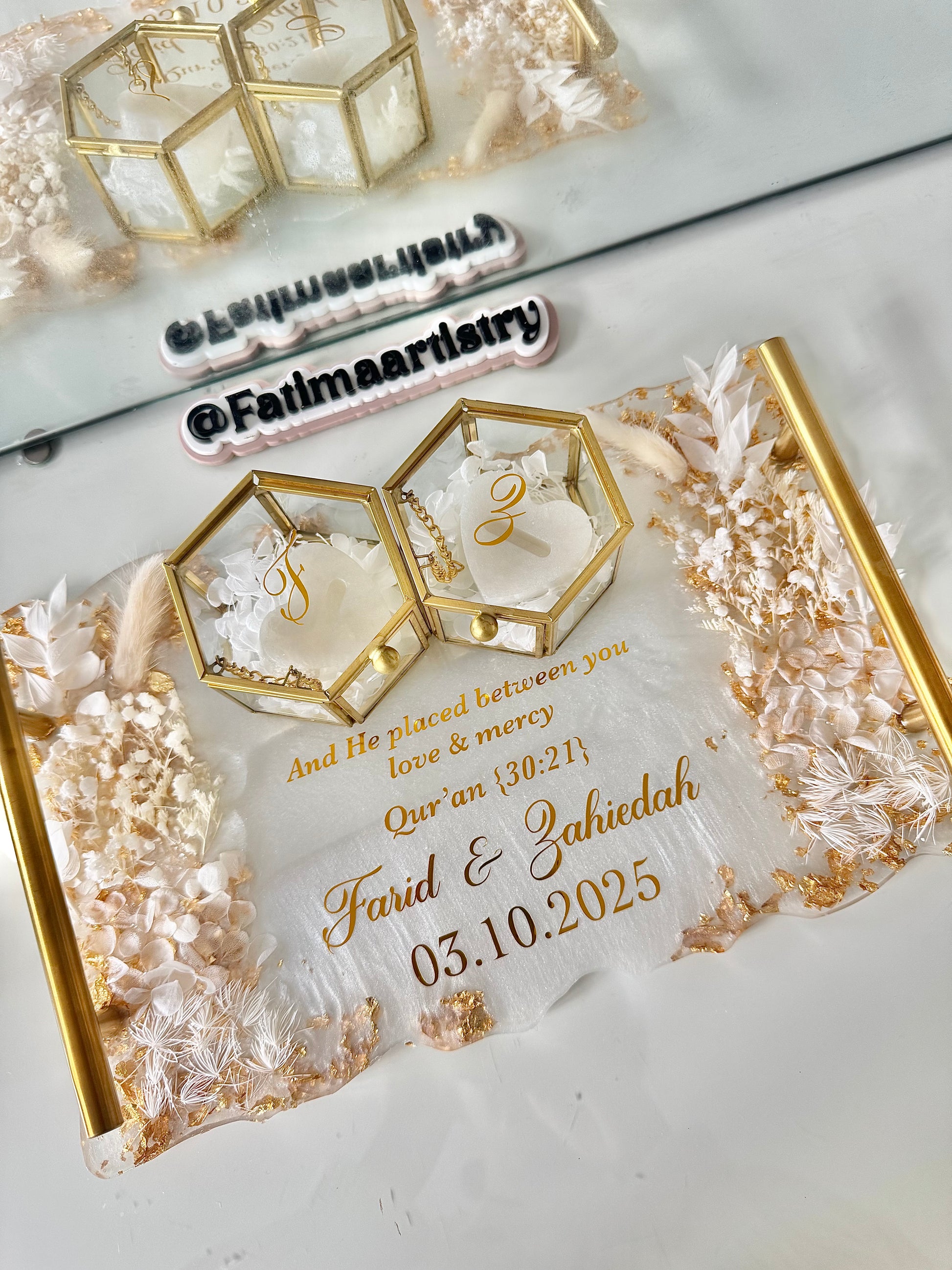 A unique tray with dried white flowers with bunny tails, preserved beautifully on top of the resin. Complimented with gold flakes for a vibrant look. Personalised with gold chrome vinyl and gold handles.